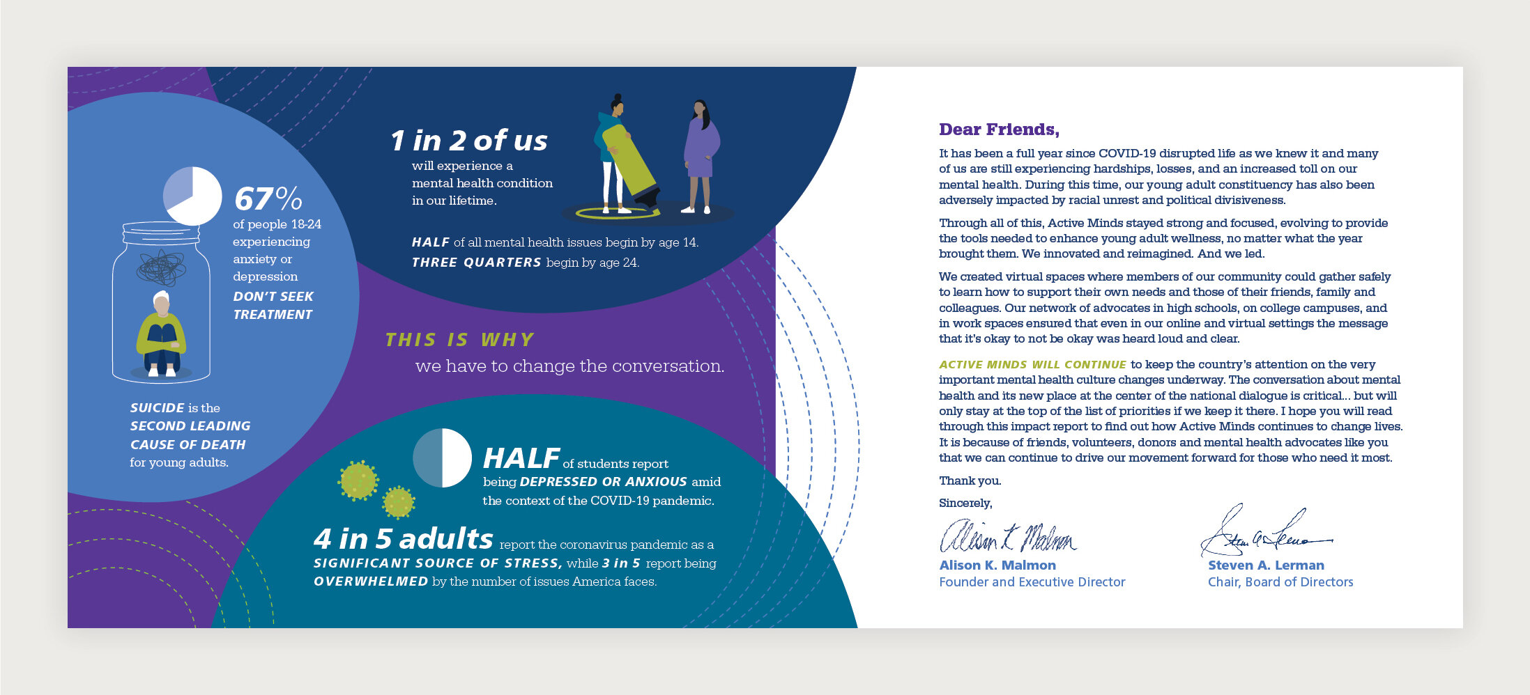 design for Active Minds’ 2020 Impact Report, a 24-page document sharing the organization’s progress in changing the conversation about mental health